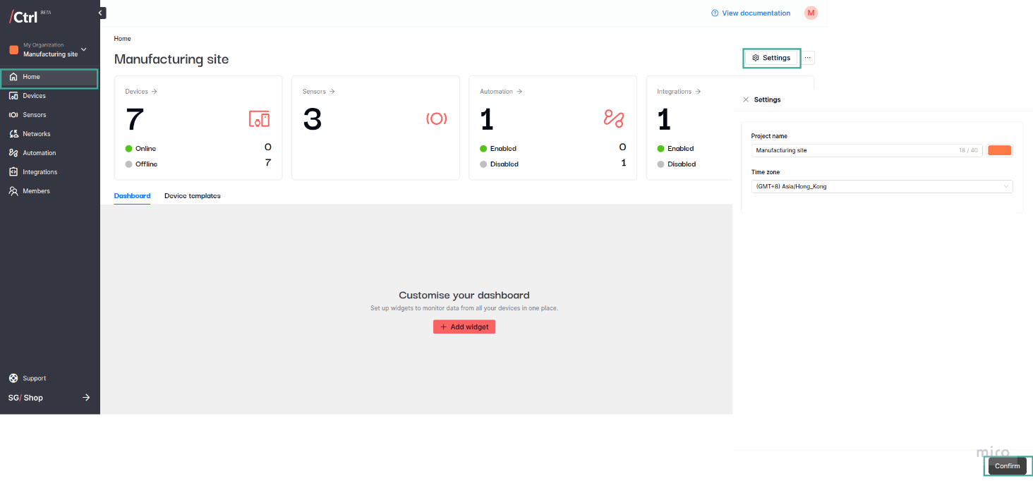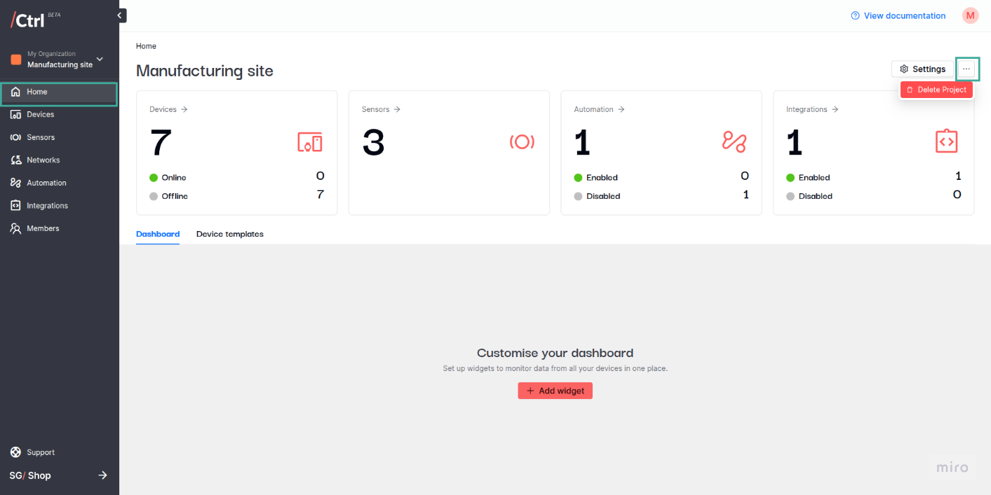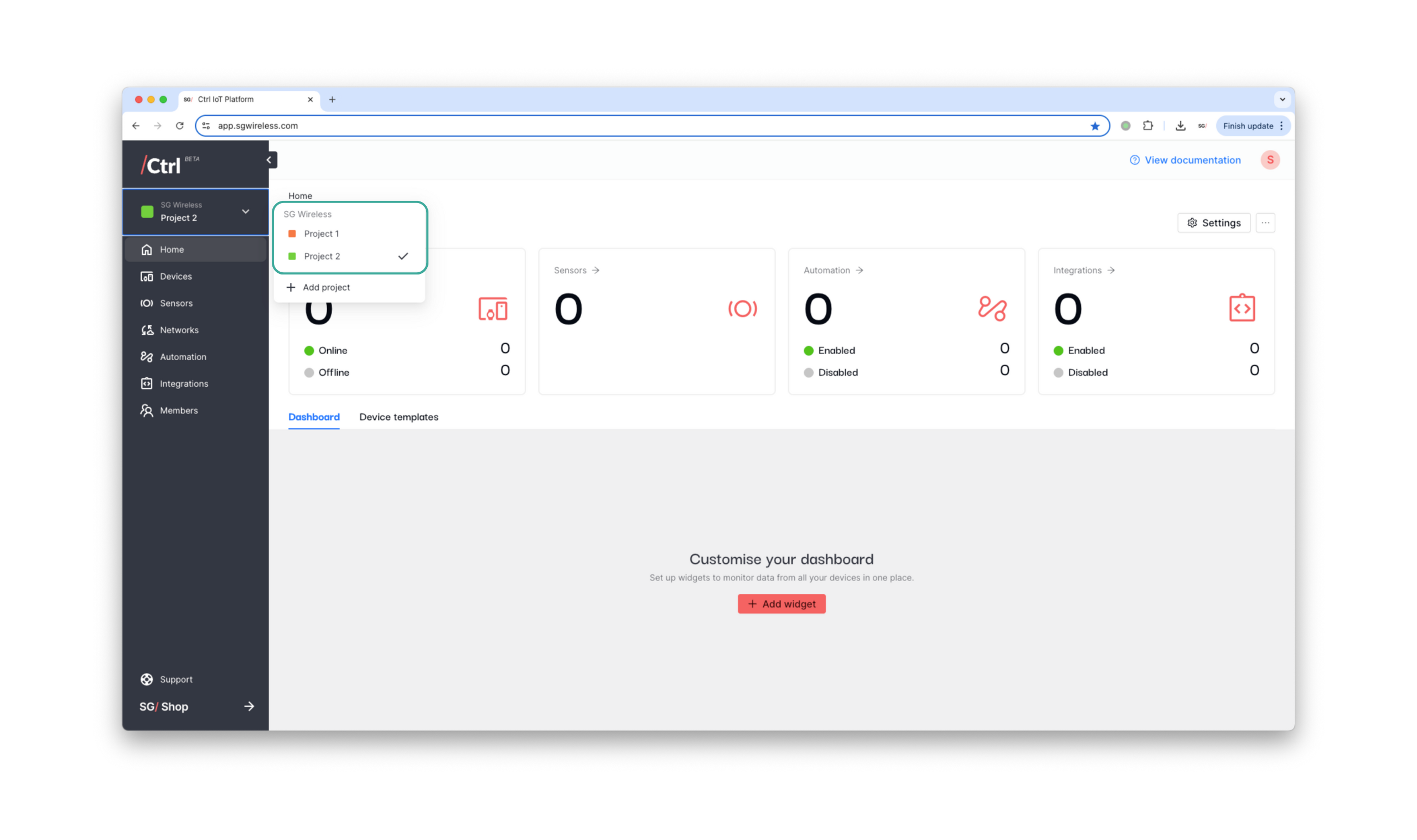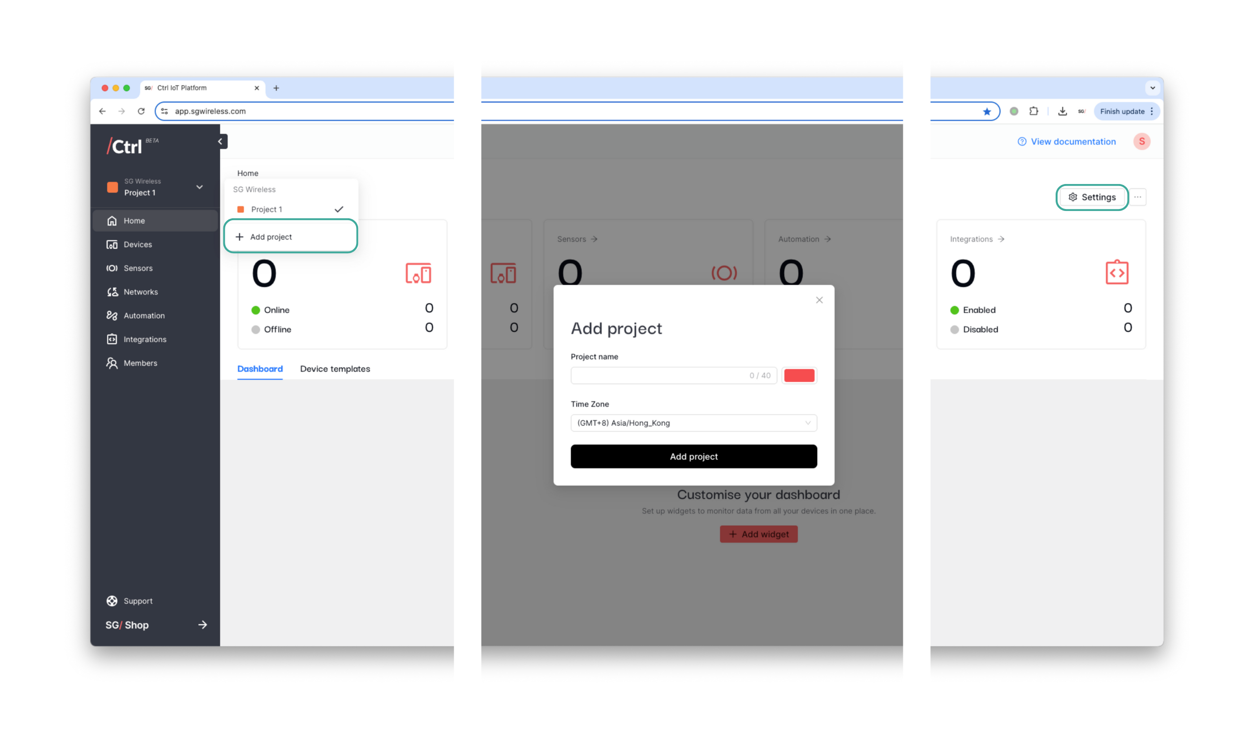 Your initial project is automatically generated when you create your account. You can establish multiple projects to organize different groups of IoT assets based on your requirements. Each project stores its IoT assets along with relevant information, such as templates, devices, sensors, network profiles, automation rules, integrations, and member management.